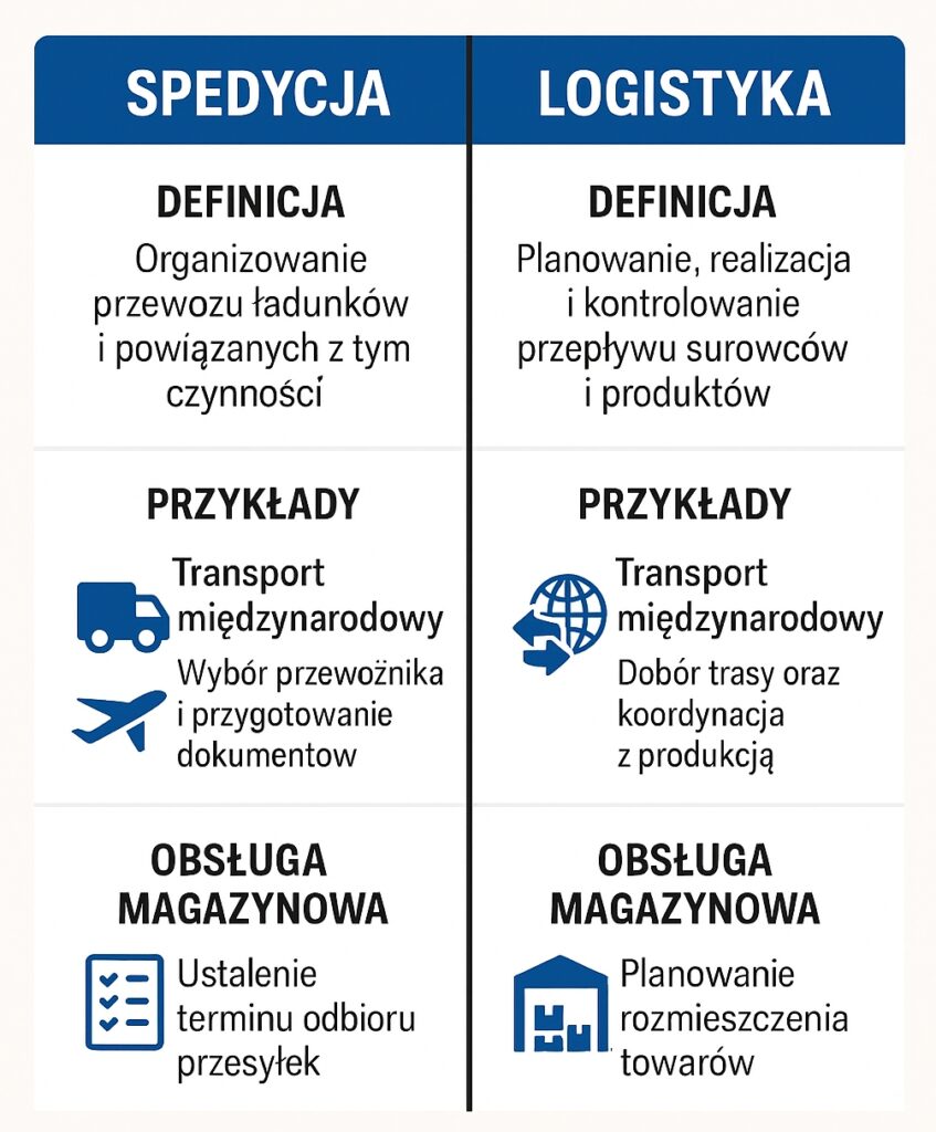 Spedycja stanowi węższy, wyspecjalizowany wycinek logistyki – jej zadania dotyczą głównie organizacji transportu, podczas gdy logistyka obejmuje szerszy zakres działań w całym łańcuchu dostaw. Oto kluczowe różnice: