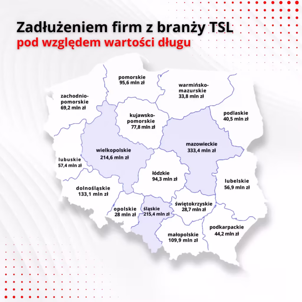 Skalę trudności dobrze ilustrują dane Krajowego Rejestru Długów. Na koniec sierpnia 2025 r. zadłużenie firm TSL sięgnęło 1,64 mld zł, co oznacza wzrost o 209 mln zł w porównaniu z rokiem ubiegłym i o 104 mln zł od początku roku. Liczba dłużników wyniosła 32,1 tys. i była o 1,2 tys. większa niż rok wcześniej. Średnie zadłużenie wzrosło w tym czasie z 46,6 tys. zł do 50,9 tys. zł. Największa część tego długu – 1,3 mld zł – przypada na transport drogowy towarów.